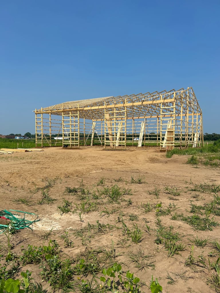 The latest photos capture the wooden skeleton stretching toward a clear blue sky, framed by gravel and sprouting fields—a true sign of growth.