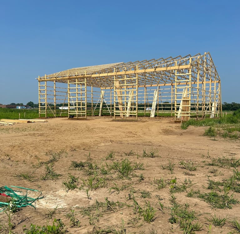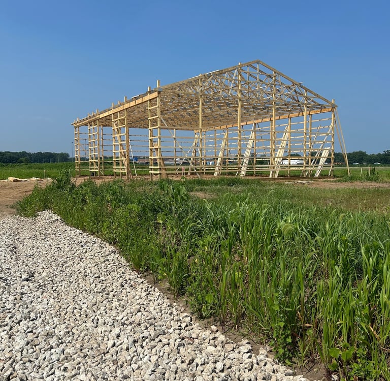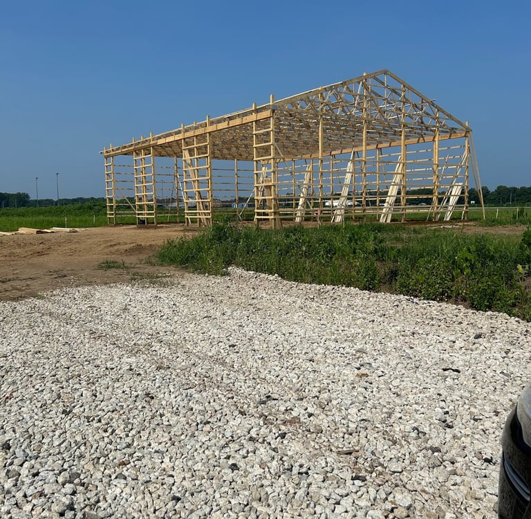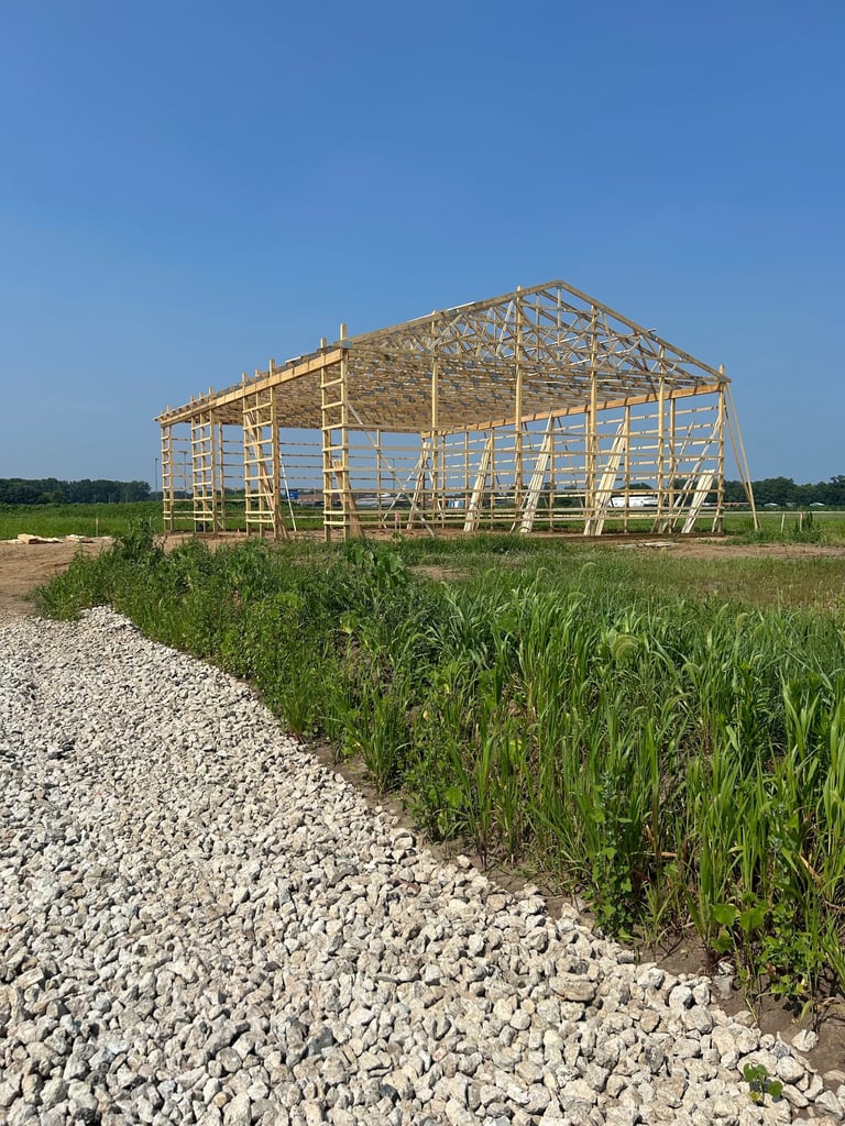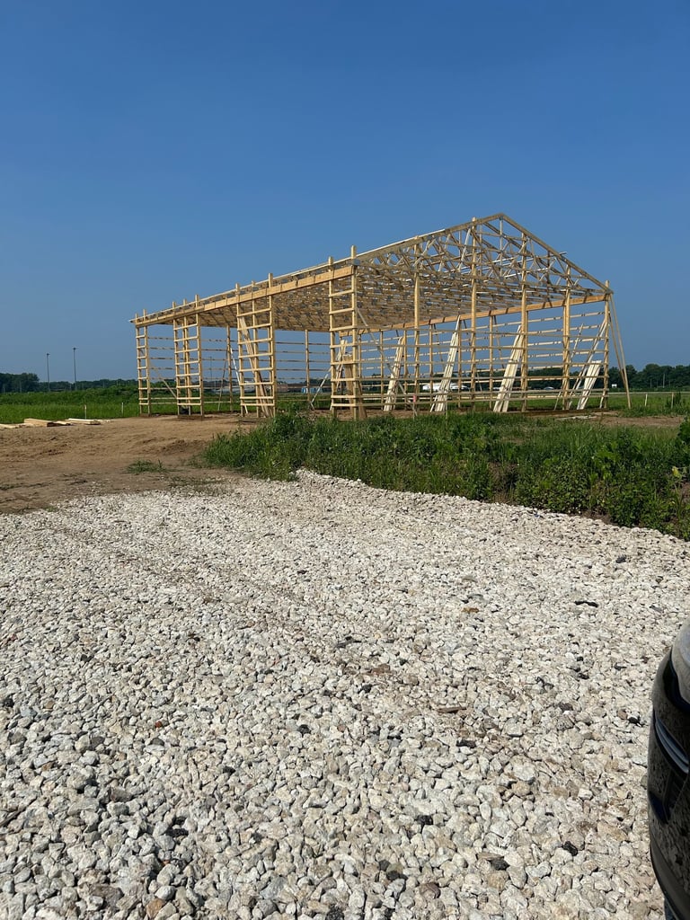 Construction at Diamond Garage Condos (DGC) is standing proud in Cassopolis, Michigan! Today, Mike Knepple and his team have added the trusses on our first post-frame building.